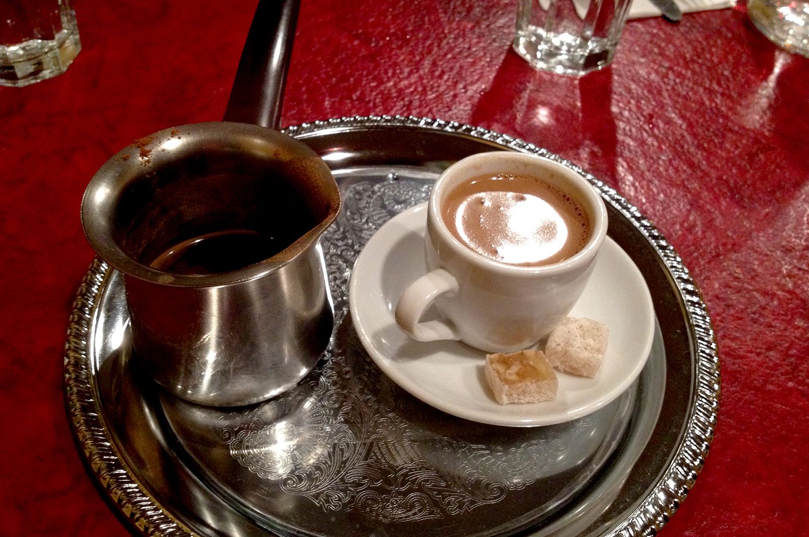 Пьется в любое время суток и в неограниченных количествах (к чаю же, напротив, в Греции относятся без пиетета). Напиток готовят в джезве на горячем песке или в газовой горелке, отличительная особенность — зерна очень мелкого помола, стертые в порошок. Традиционный кофе по-гречески называется ellinikós kafés и бывает нескольких уровней сладости: Σκέτος (скетос) — черный кофе без сахара, Μέτριος (метриос) — с одной чайной ложкой, в Γλυκός (гликос) добавляют две ложки сахара.