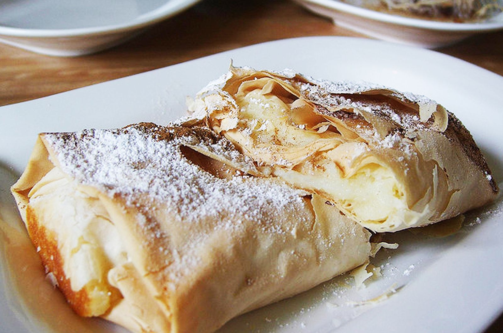 Нежно любимый греками слоеный пирог. Чаще всего он сладкий, с начинкой из заварного крема или сыра; реже бугацу пекут с фаршем или шпинатом. Начинки здесь так много, что пирог иногда называют греческой версией штруделя. Кусочек в пекарнях стоит 2–3 евро, в супермаркетах можно купить целую замороженную бугацу за 5–6 евро — ищите коробки с надписью Μπουγάτσα.