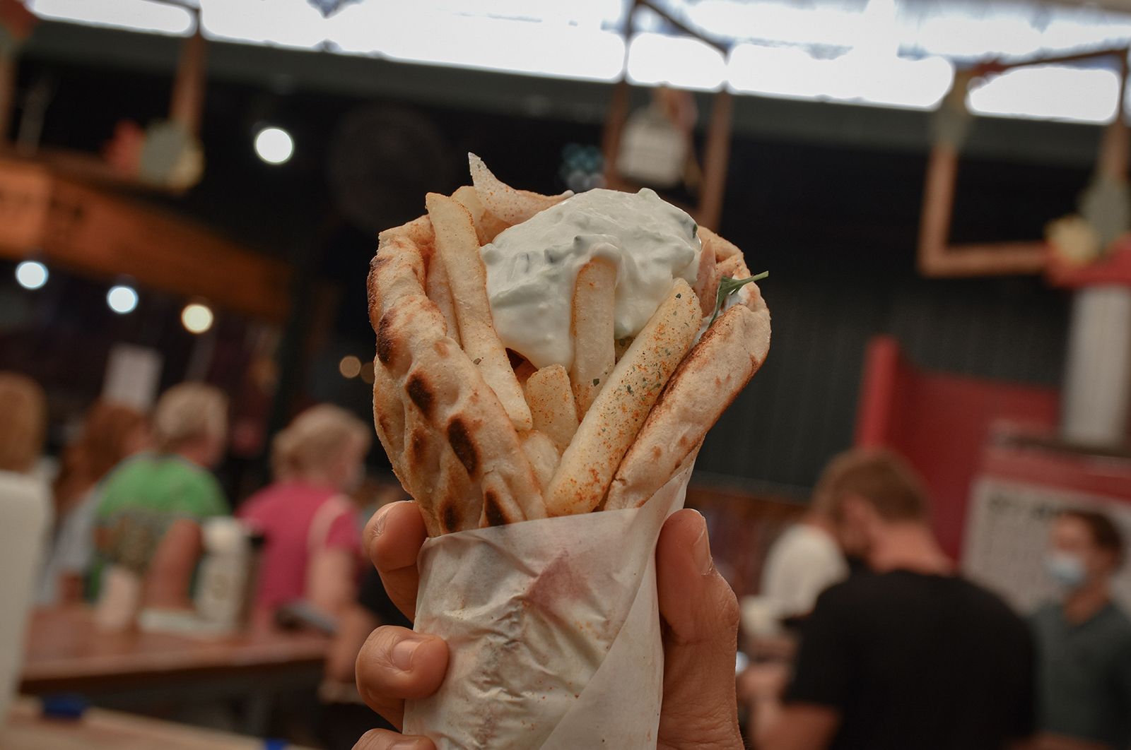 Гирос — легендарный греческий фастфуд, похожий на шаурму: мясо обжаривают на вертикальном гриле, затем с боков срезают небольшие кусочки и кладут в подогретую питу. К ней добавляют картофель фри, овощи, лук и соус, чаще всего дзадзики.