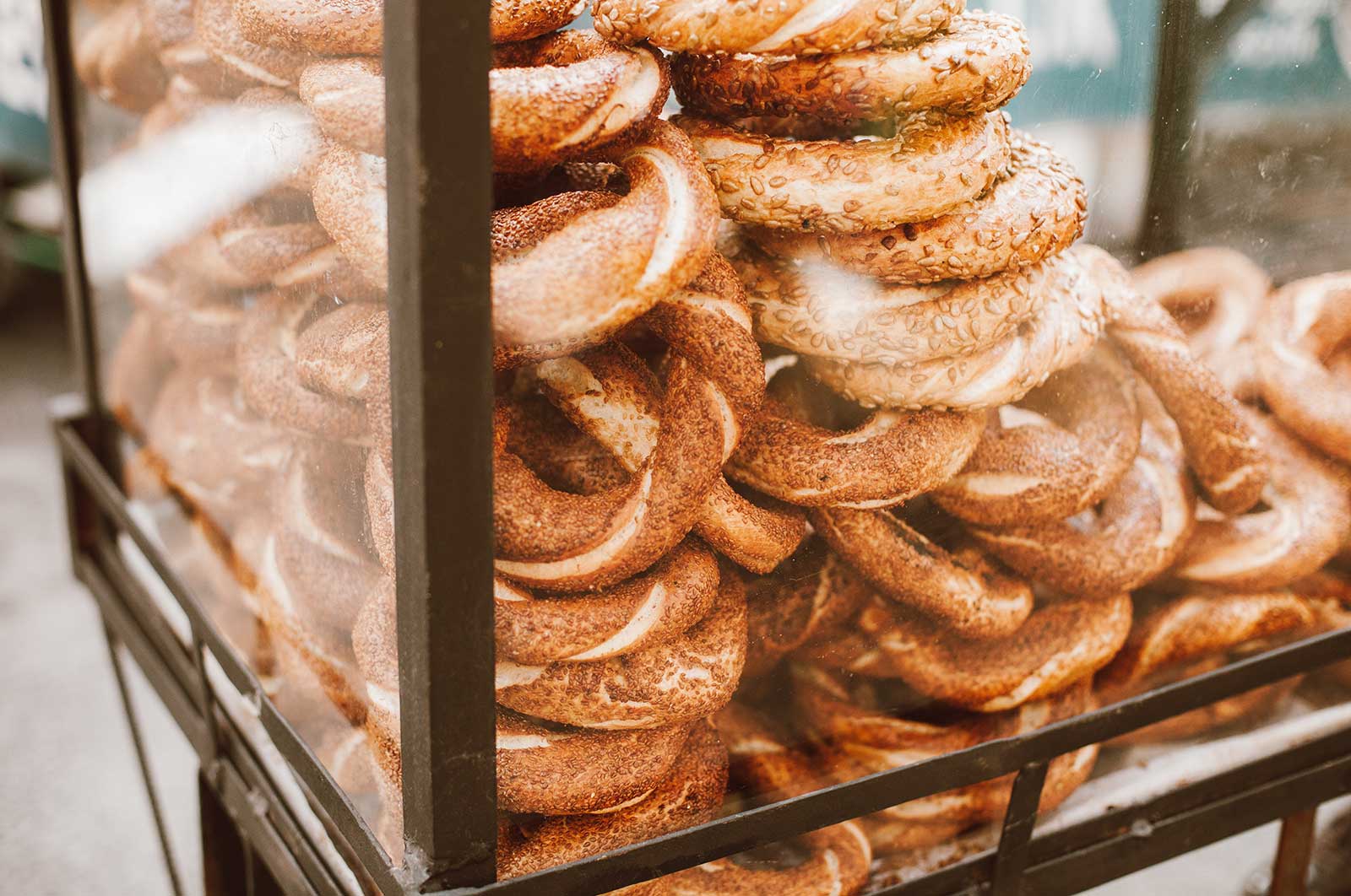 Турецкий бублик с дыркой, посыпанный кунжутом. Бывает с разными семечками, а правильный симит замешивается на сладком фруктовом сиропе (он называется пекмез) и печется в дровяной печи. Симит должен быть чытыр, то есть хрустящим снаружи и мягким внутри. Обычно их пекут три раза в день — утром, в обед, последняя маленькая партия — к пяти. По улицам очень часто ходит разносчик симитов, симитджи — его можно выкликнуть из окна, но, чтобы получить заказ, нужно обзавестись ведром и веревкой, иначе придется спускаться.