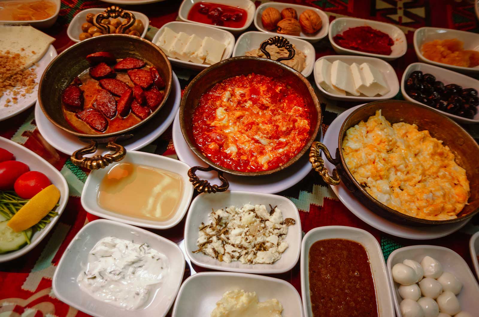 Мероприятие для сильных духом. Турецкий завтрак на неделе — быстрый перекус из продуктов, которые всегда найдутся в холодильнике: сыр, пара оливок, помидоры с огурцами, вареное яйцо. Но воскресный турецкий завтрак — это многочасовое сидение над десятками маленьких тарелочек с сырами, разнообразными закусками, жареными лепешками с начинкой, домашними вареньями и, конечно, с бал-каймаком, медом с жирными плотными сливками. В специальных заведениях (их можно найти по слову kahvaltı) завтрак подается до четырех, а иногда и до семи часов вечера; вообще хороший тон — завтракать в воскресенье не дома.