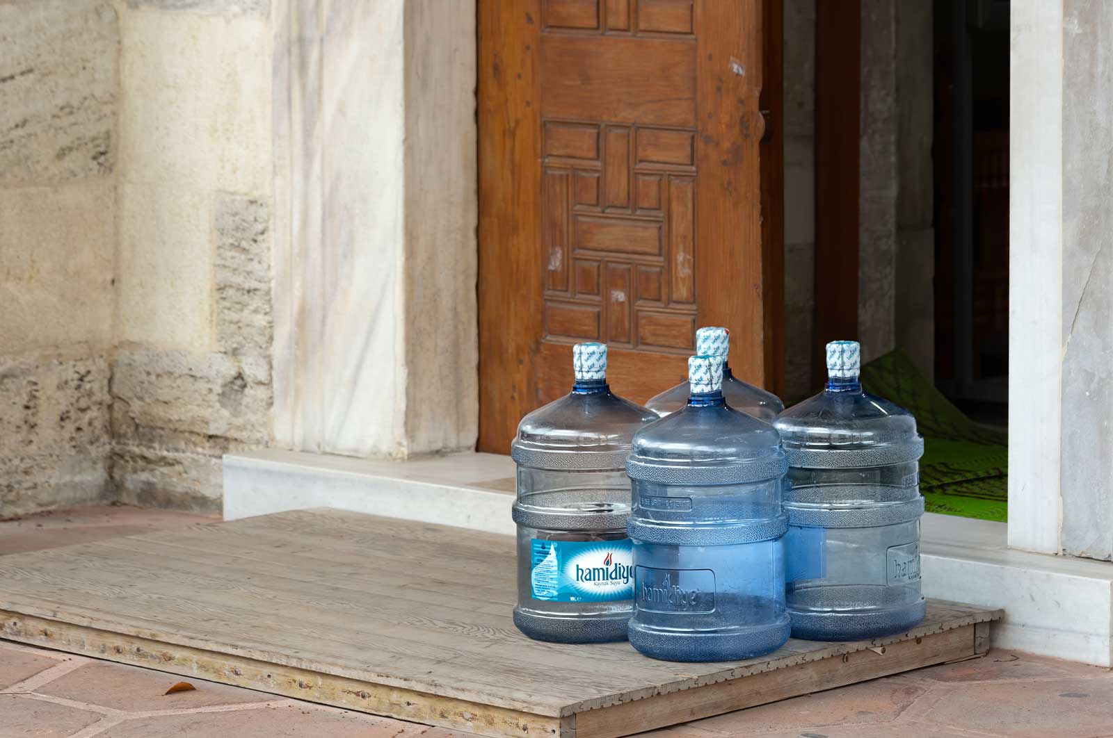 Бутылка воды на 19 литров. Воду из-под крана в Турции не пьют и даже не используют для готовки. Существует множество фирм, которые доставляют воду в больших бутылях на дом; у них же можно заказать насос-помпу. Удобнее всего заказывать воду через приложения, например BiSU, но надо помнить, что, как и многое в Турции, выбор марки воды — дело политическое: в Стамбуле, например, принято заказывать (или подчеркнуто не заказывать) воду Hamidiye, которая с османских времен разливается городскими властями, — это жест поддержки оппозиционного стамбульского муниципалитета.