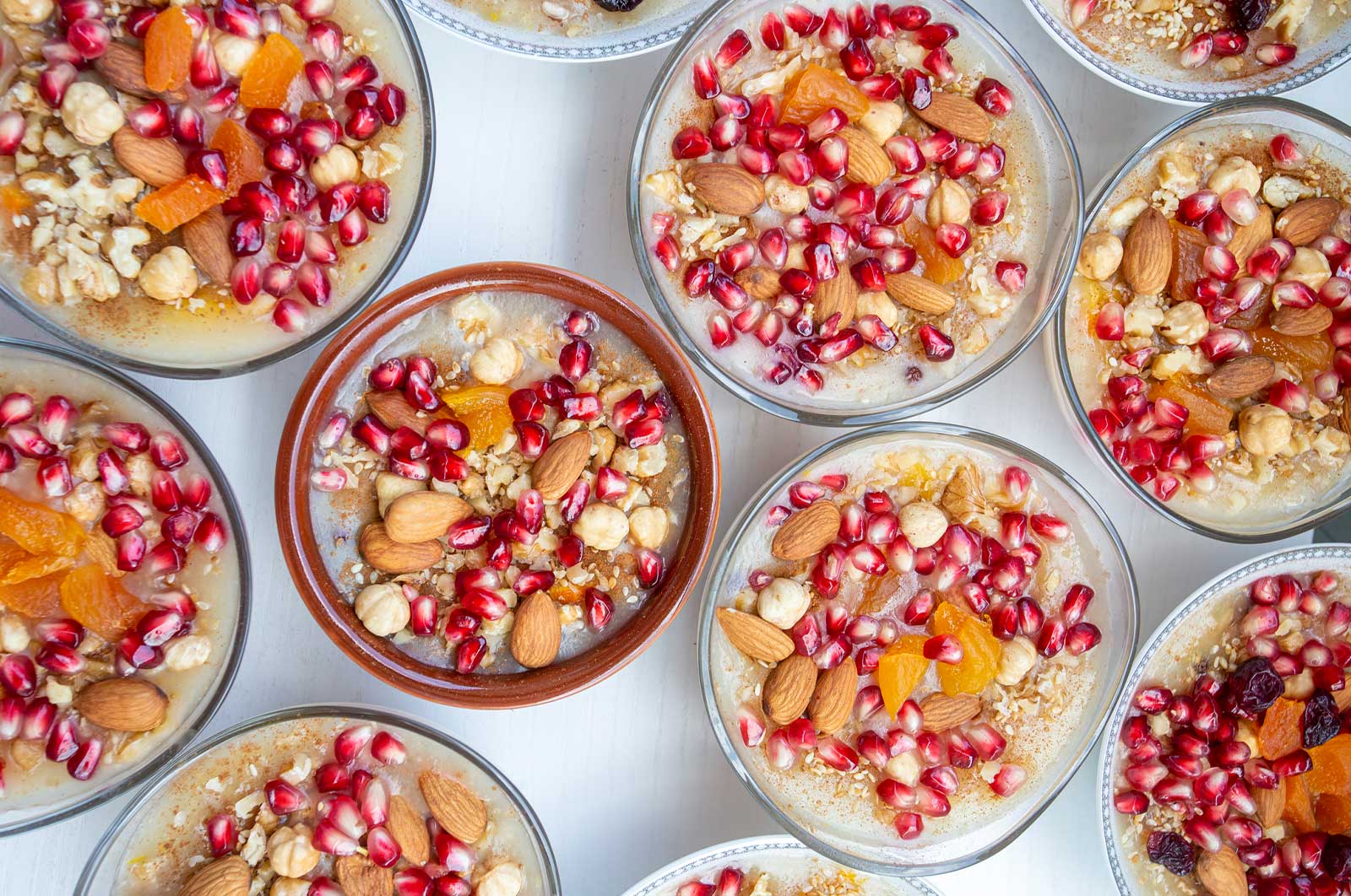 Пудинг из пшеницы, бобовых, орехов и сухофруктов можно найти в меню многих кафе, но у него есть свой особый день в году — день Ашуре, десятый день Мухаррама, первого месяца мусульманского календаря. Мусульмане-сунниты (которых в Турции большинство) верят, что в этот день Ноев ковчег причалил к твердой земле после Великого потопа, и, чтобы накормить всех, кто выжил, Ной использовал все оставшиеся продукты. Поэтому в день Ашуре готовят блюдо, в которое входит всего понемногу: считается, что в ашуре должно быть не менее семи, а лучше десяти ингредиентов. Традиция предписывает угощать ашуре друзей и соседей, так что не удивляйтесь, если в конце дня Ашуре у вас дома окажется недельный запас пудинга, и не забывайте, что посуду, если она не одноразовая, необходимо вернуть. Желательно не пустой.